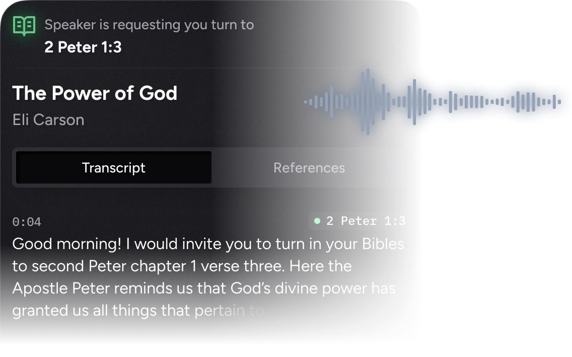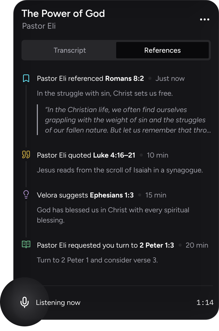 When the sermon starts, tap to begin a relay. Velora will listen along and gracefully pull up passages as the preacher references or even alludes to them.